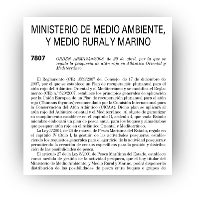 La protección y conservación del atún rojo del Atlántico Oriental y Mediterráneo. Diferentes informes de organismos oceanográficos y biológicos, alertan del peligro de extinción de la especie. Para evitarlo dictaminan una ley en la cual se asigna a cada uno de los países miembros de la CEE, un cupo, con el fin de que les permita regular la pesquería del atún. Hasta aquí todo correcto. En cuanto a España, el “El Ministerio de Medio Ambiento, y Medio Rural y Marino”, es el encargado de administrar el cupo otorgado por la CEE y que afectará a nuestros puertos y por deferencia a sus pescadores.